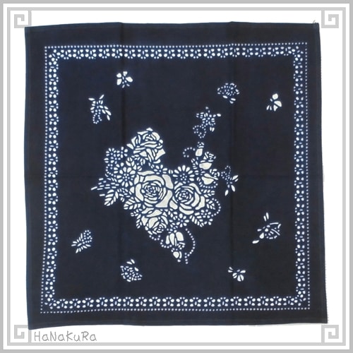 藍染め ハンカチ 40cm A 「薔薇舞蝶」 印花布 両面染め 綿100%