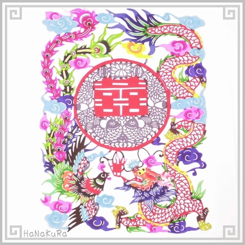 切り絵 剪紙 M105 工芸品 龍鳳双喜 彩色 22×17cm