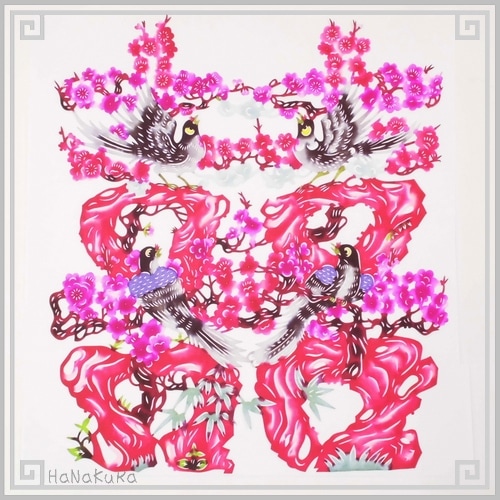 切り絵 剪紙 M106 工芸品 梅双喜 彩色 22×19cm