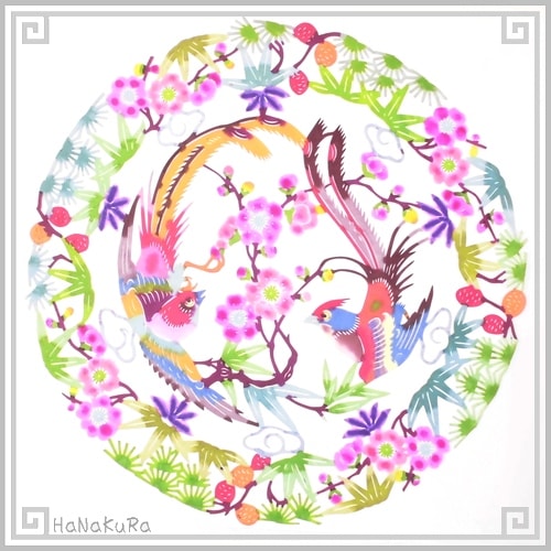 切り絵 剪紙 M108 工芸品 双鳥松竹梅 彩色 直径21cm