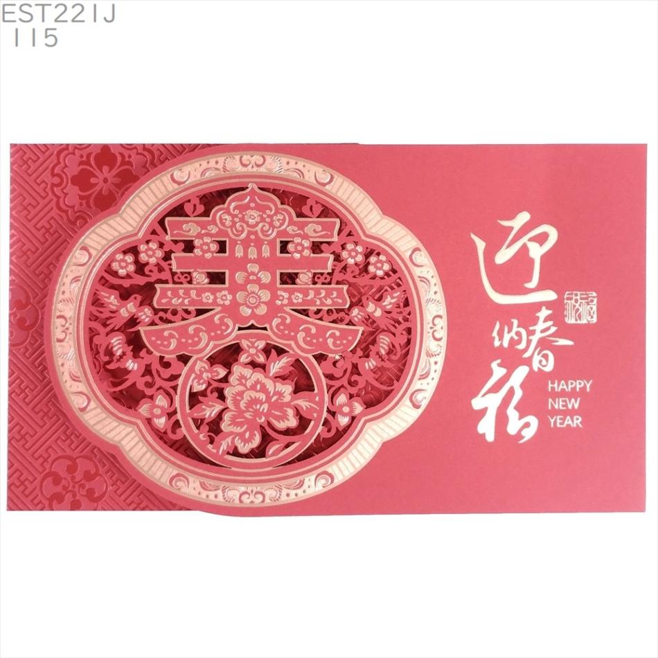 中国 春節 年賀カード 新年 年賀状 小J115[横] 剪紙紅春 迎春納福 2026年 正月 グリーティングカード 賀年片
