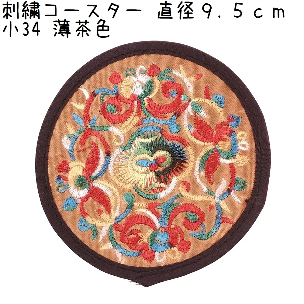 刺繍 コースター 円形 小34 薄茶色 直径9.5cm 1枚 中国 お土産