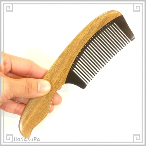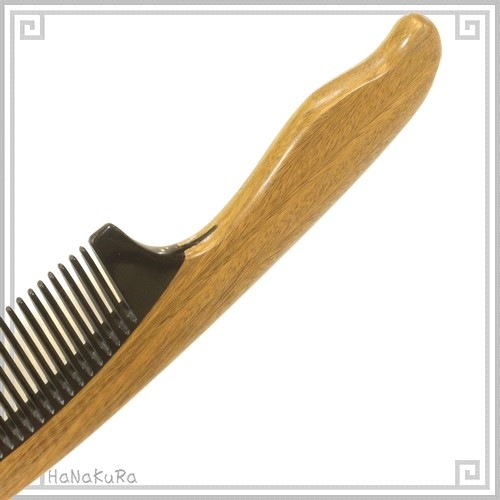 持ち手部分は緑檀(りょくたん)という木、櫛の歯(黒い部分全体)には水牛角粉末を固めた物を使用しています。