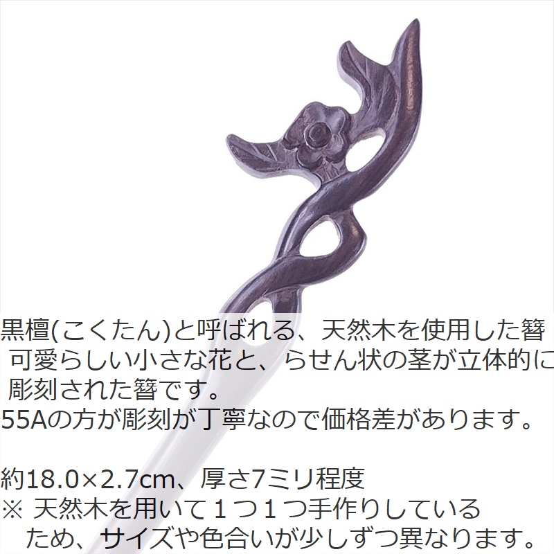 可愛らしい小さな花と、らせん状の茎が立体的に彫刻された簪です。55Aと55Bはほぼ同一デザインですが、55Aの方が彫刻が丁寧なので価格差があります。