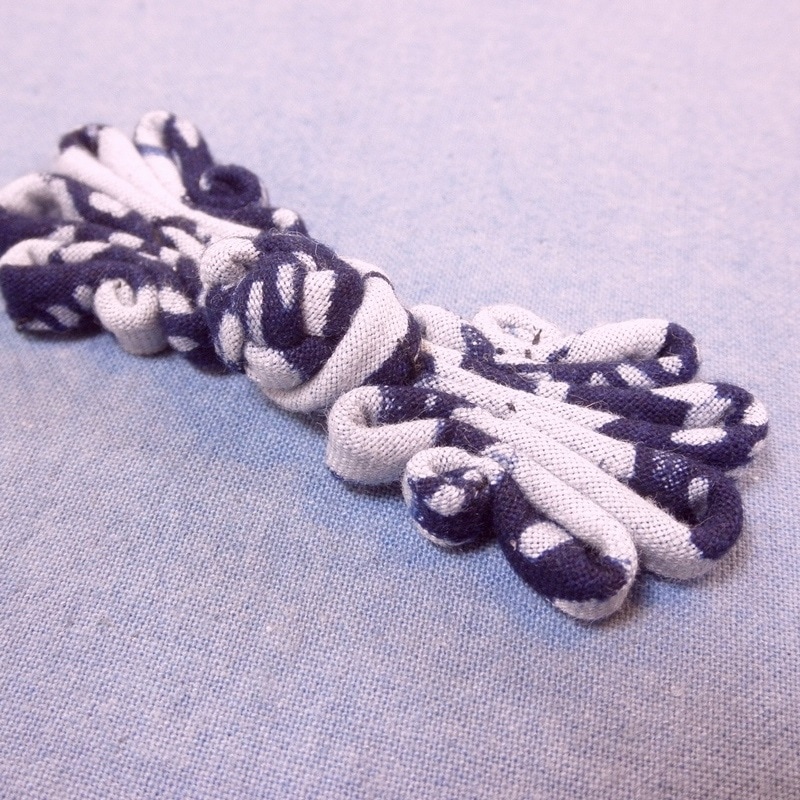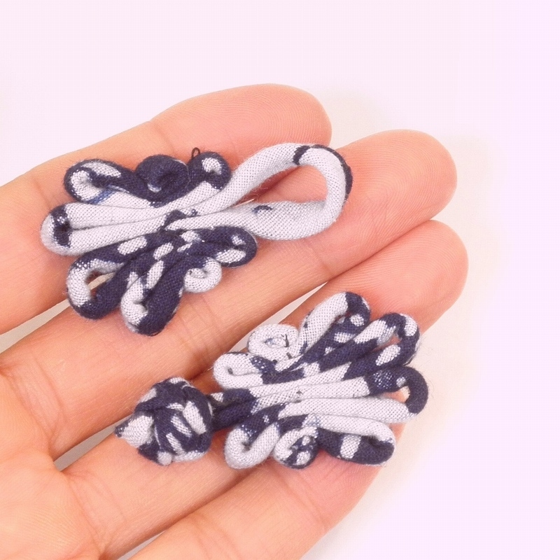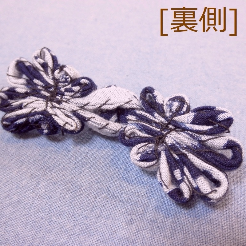 当店で扱っている藍染生地を使用した、蝶々のようなデザインの中華釦(チャイナボタン)です。
