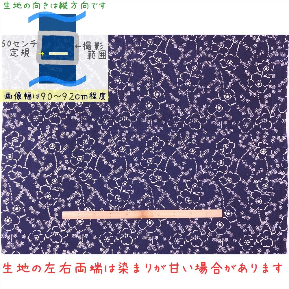 藍染め 生地 幅90cm 藍色54 大牡丹 藍印花布 1m単位 綿100% 片面染め ロットNo2012