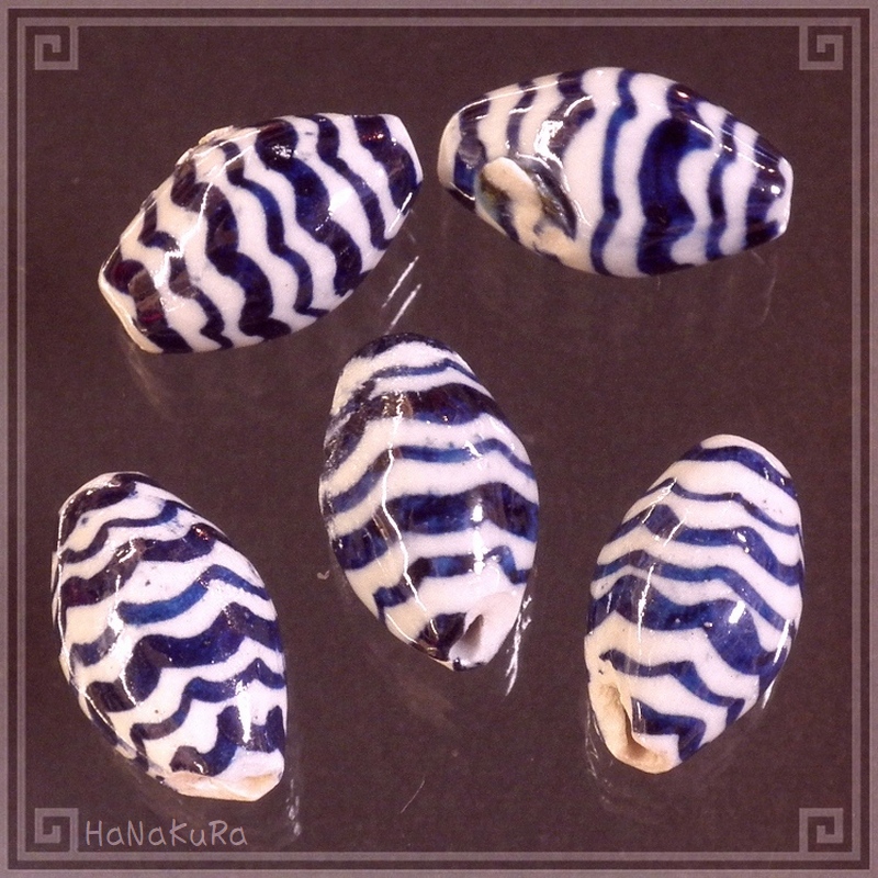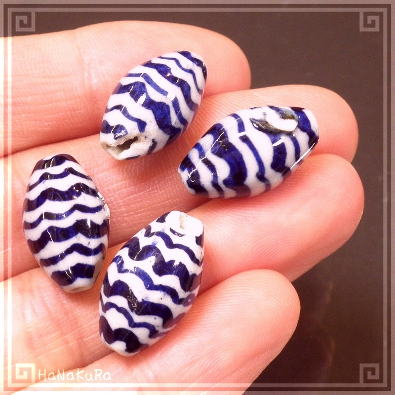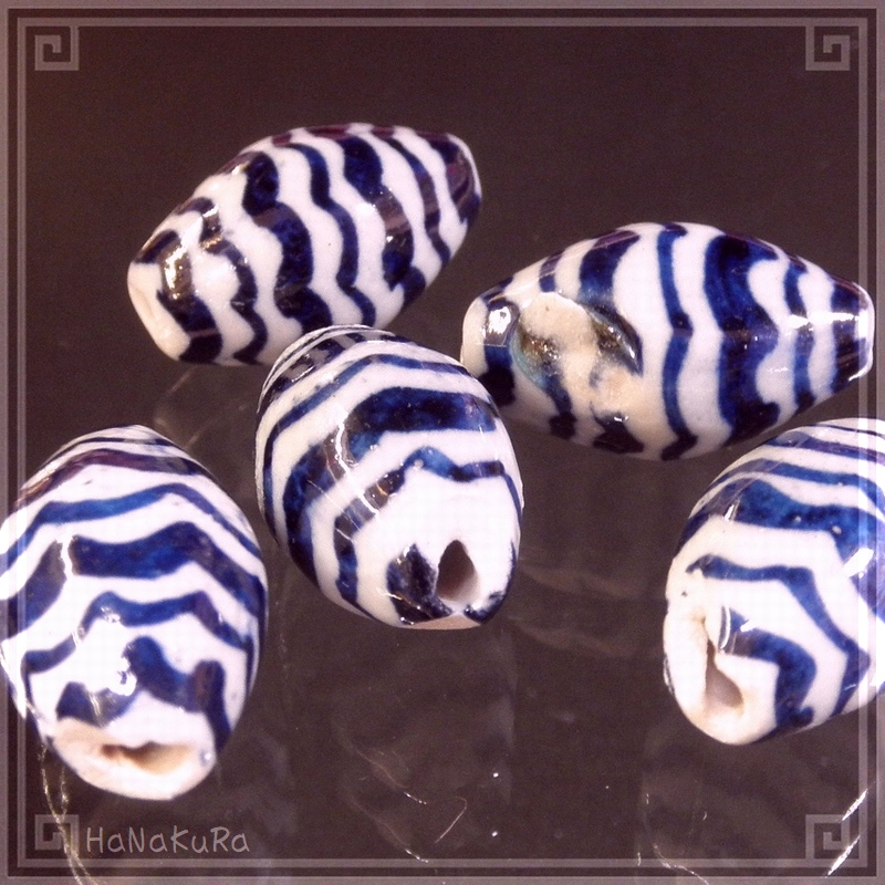 陶磁器 ビーズ 楕円形 20×12mm 波紋[訳あり] 手描き 染付 青花 1個