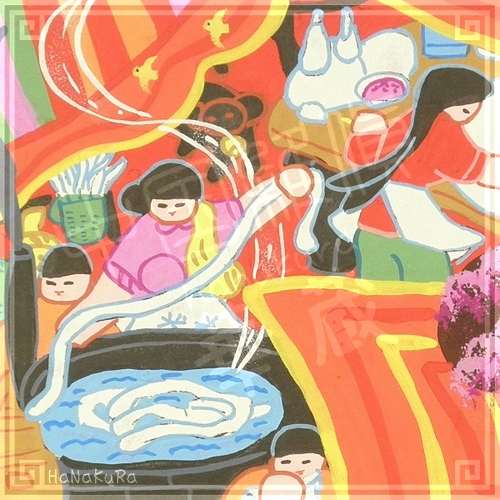 中国 農民画57 誕生日と長寿麺 手描き絵 25cm