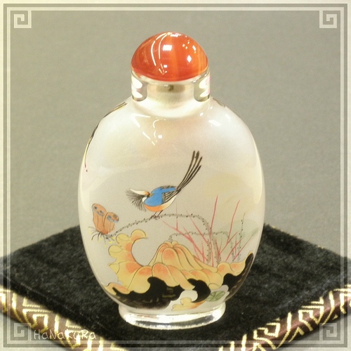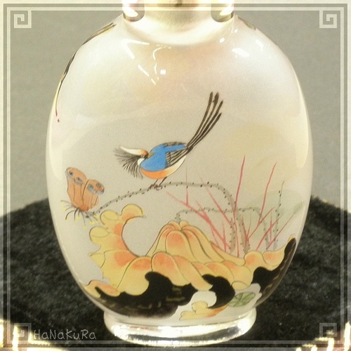 鼻煙壷 鼻煙香 44 ジョウビタキとアオカケス 内側から手描き 工芸品 鼻煙壺 内絵 ガラス瓶