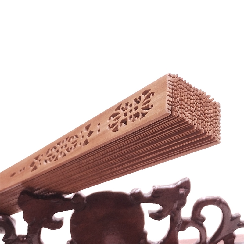この扇子は、当店の創業時から取引をしている馴染みの蘇州老字号(老舗)で1980-90年代に制作された、良質で希少なインド産白檀を使った白檀扇子です。