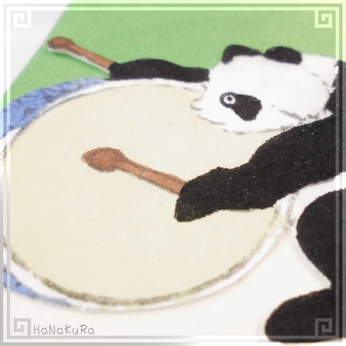 笹(竹)をイメージした台紙の上に、厚紙に手描きされた大太鼓を叩くパンダが貼り付けてあります。