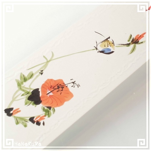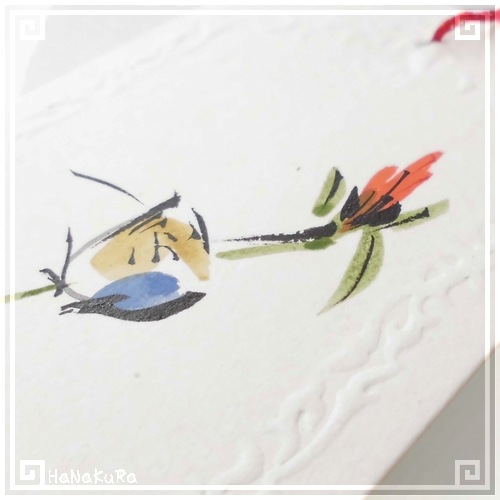 周囲を凹凸エンボス加工した無地の台紙に、花と鳥がセットで手描きされています。