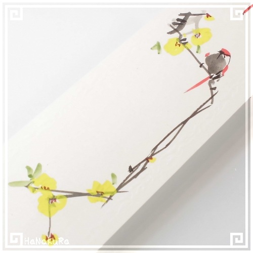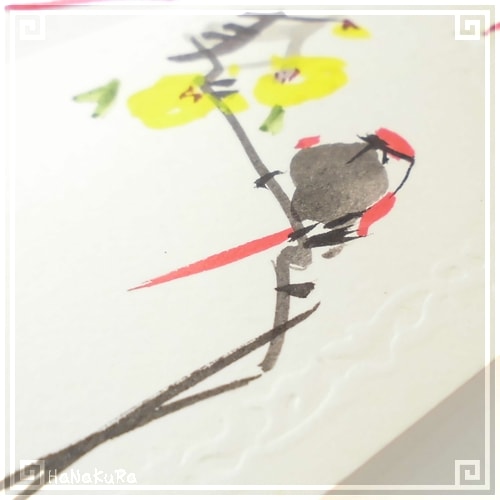 周囲を凹凸エンボス加工した無地の台紙に、花と鳥がセットで手描きされています。