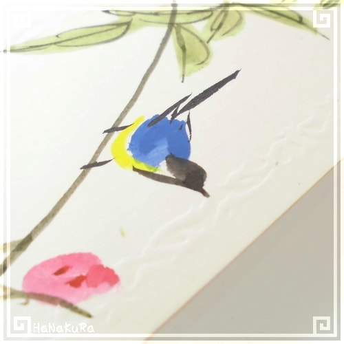 周囲を凹凸エンボス加工した無地の台紙に、花と鳥がセットで手描きされています。