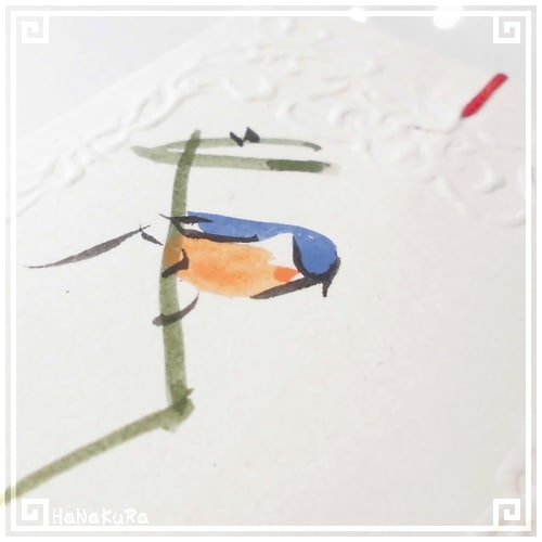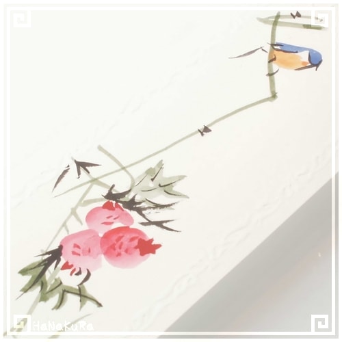 周囲を凹凸エンボス加工した無地の台紙に、花と鳥がセットで手描きされています。