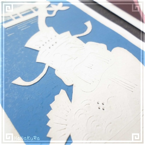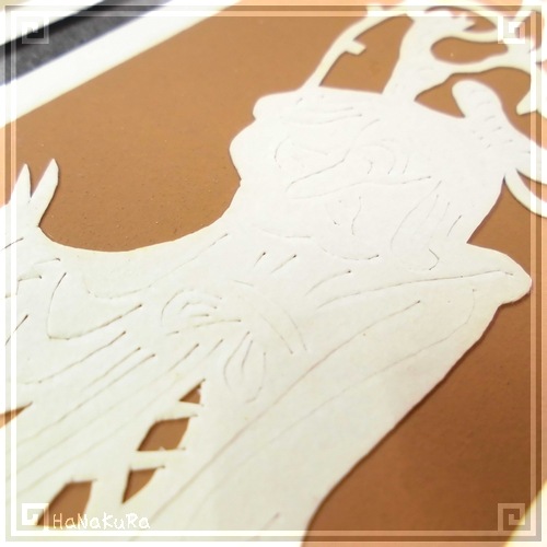 人物は紙を切って作られていますが、切り絵のように完全にくり抜くのではなく、「切れ込みを入れる」「小さな穴を開ける」事で模様を出しているのがポイントです。