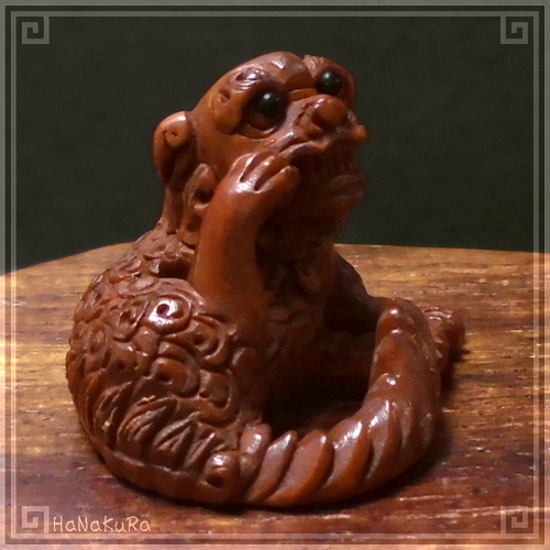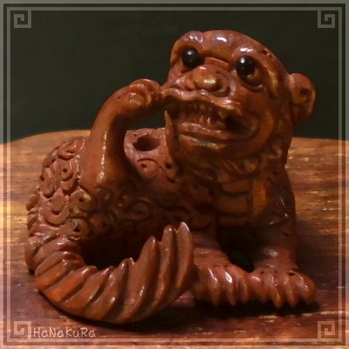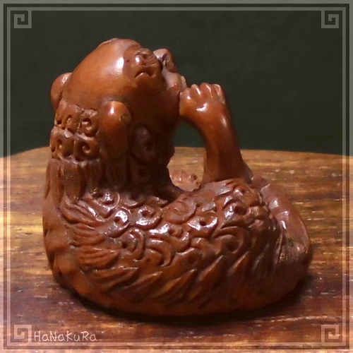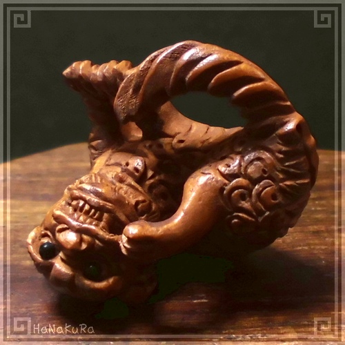 柘植(ツゲ)の木材を彫刻した獅子の小さな根付けです。