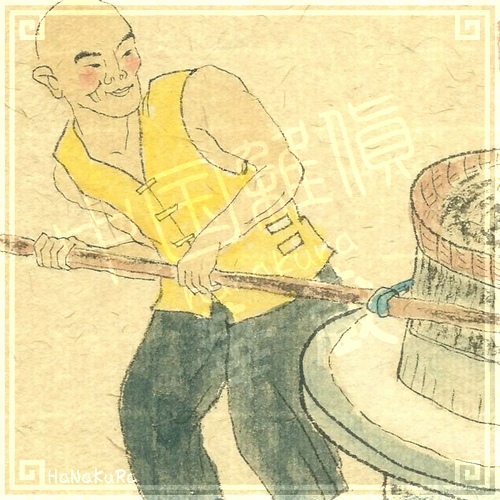 臼で小麦を挽いて、小麦粉を作っているところですね。