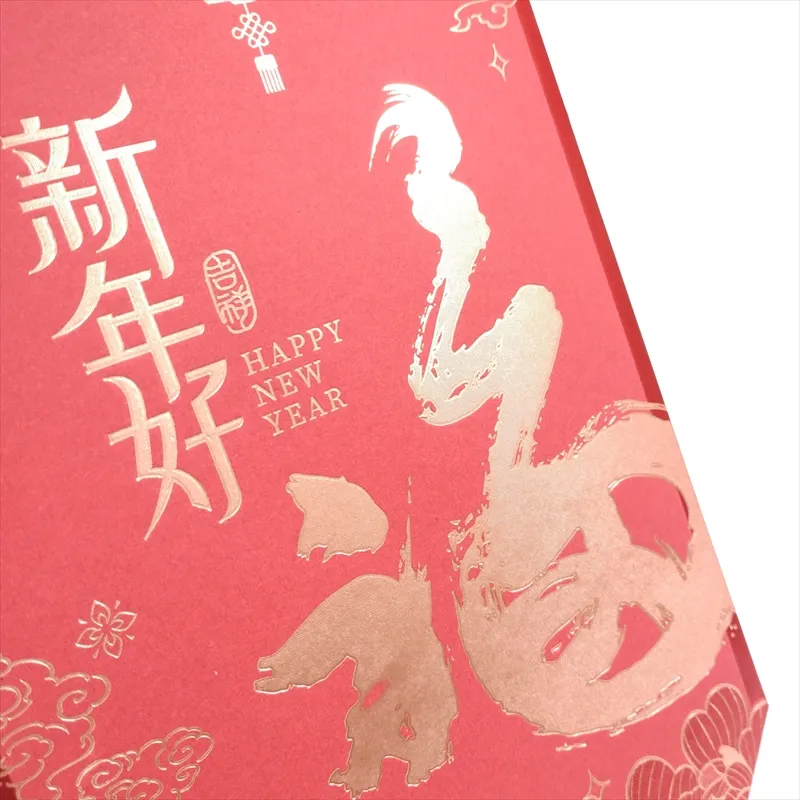 カード表面には毛筆体で大書された「福」と「新年好」の言葉が書かれています。