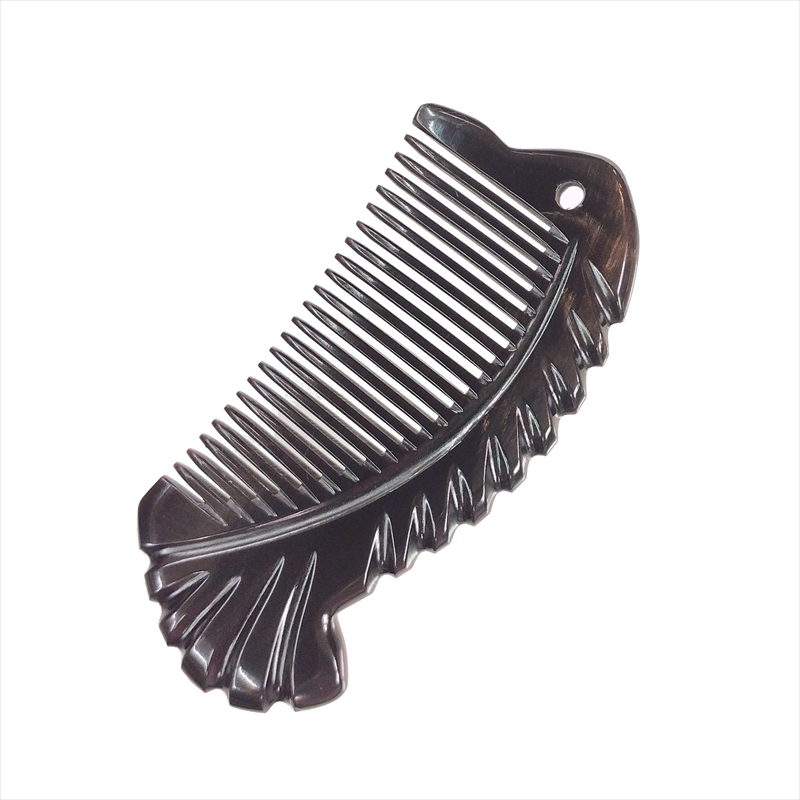 水牛角黒櫛 くし 上級品 彫刻工芸櫛 10cmD 小04 魚彫刻 黒水牛角