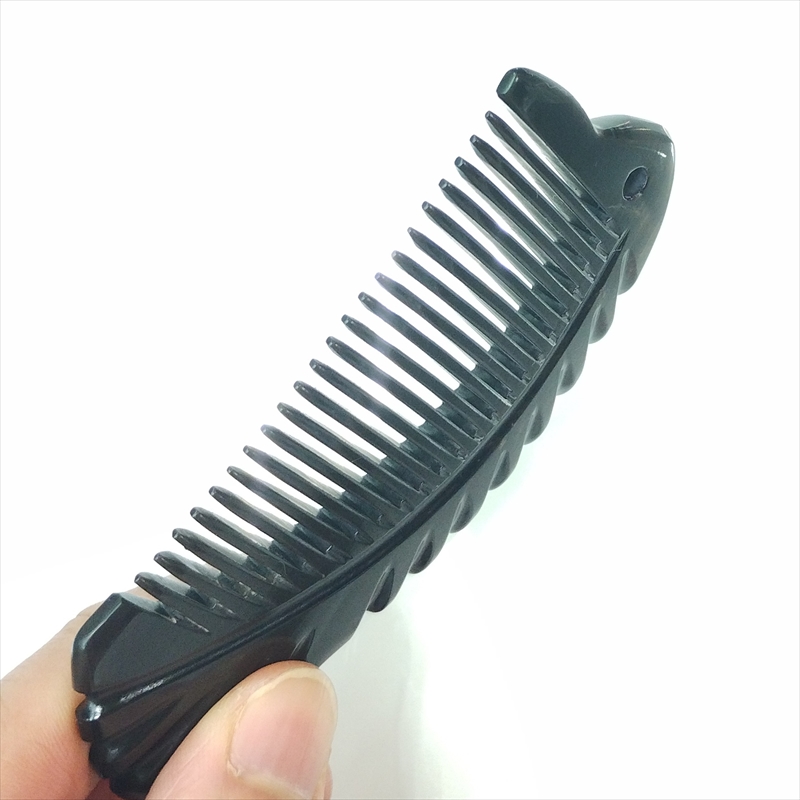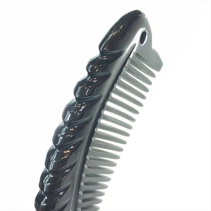 厚みのある高品質な角材を用いて、魚型彫刻を施してあります。少し小さめな、手のひらサイズの櫛です。
