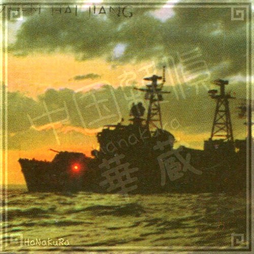 夕日に逆行になる、威厳のある軍艦がデザインされています。