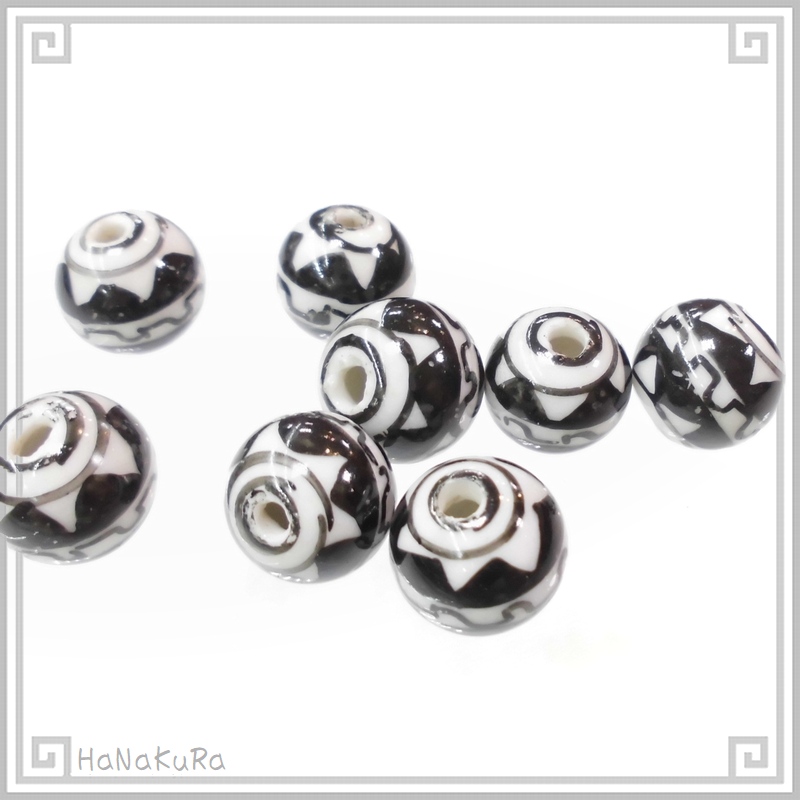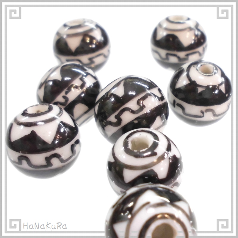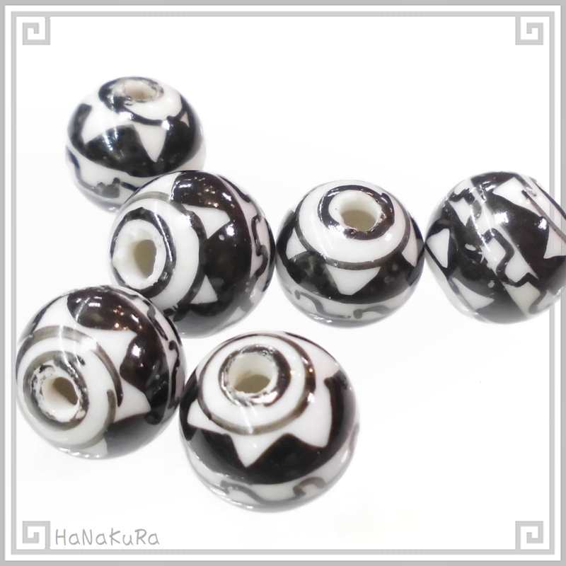 白黒で幾何学的な模様を手描きした陶器ビーズです。