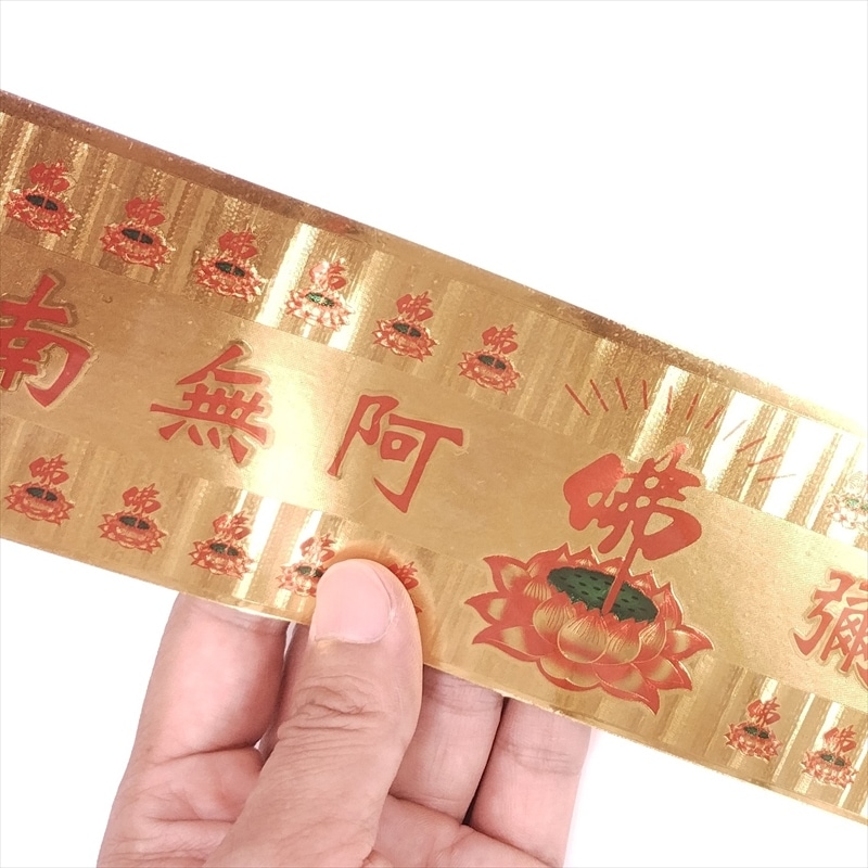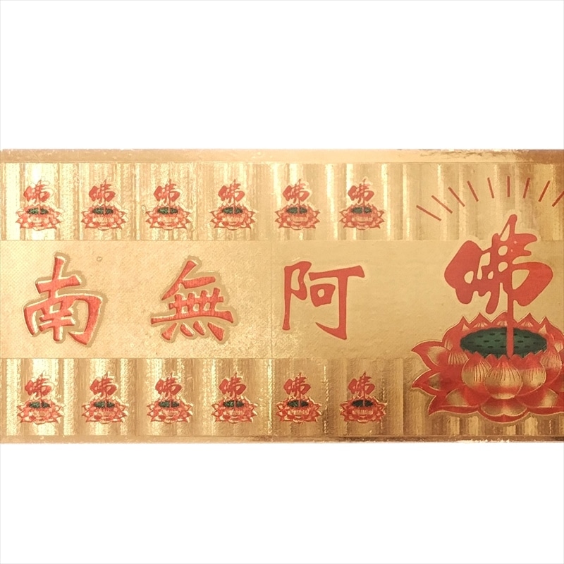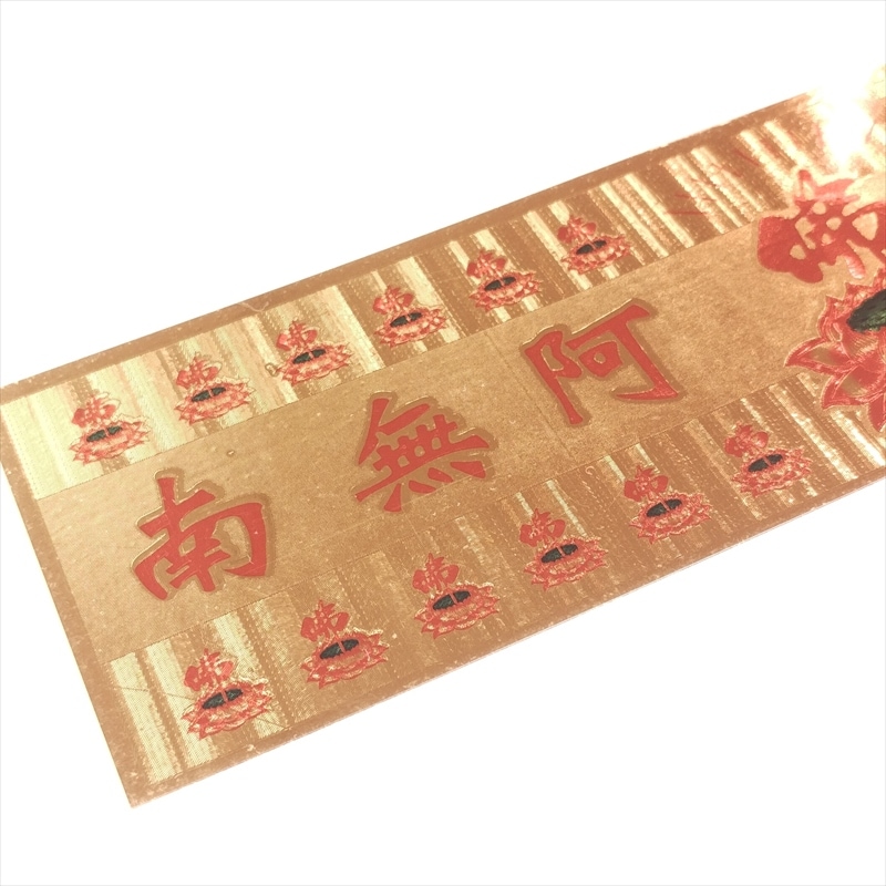 「南無阿弥陀仏」と書かれた、黄色がかった金色の大きなシールです。