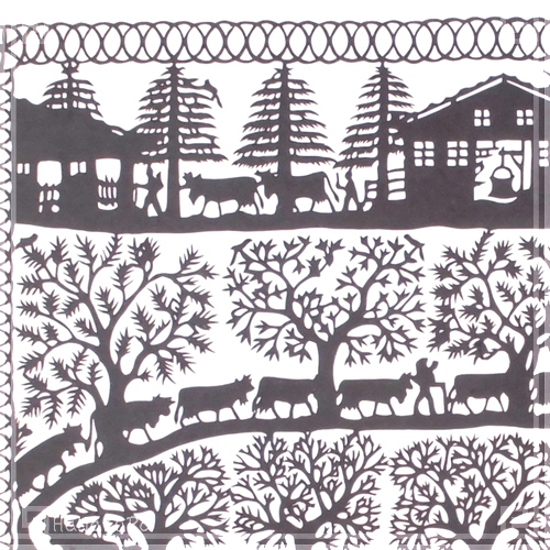 切り絵 剪紙 L114 工芸品 家と牛 24×30cm