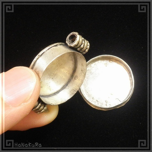 中をカパリと開けて、小さな宝物を入れておくことができます。(内部は1円玉を3枚重ねてピッタリ入るくらいのサイズです。裏ぶたを完全に外せるタイプです)