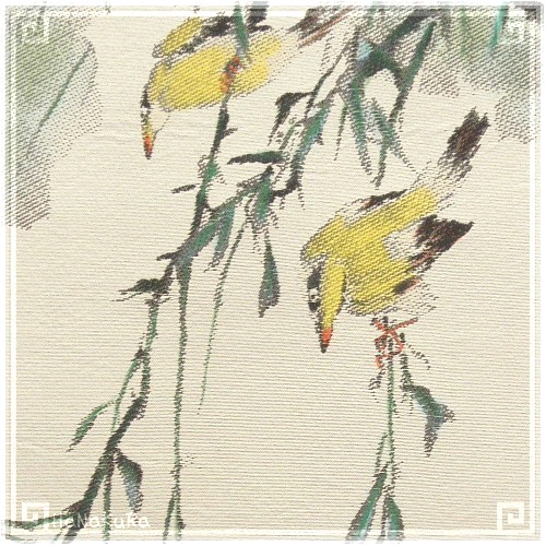 蓮とコウライウグイスが描かれた絹織物です。