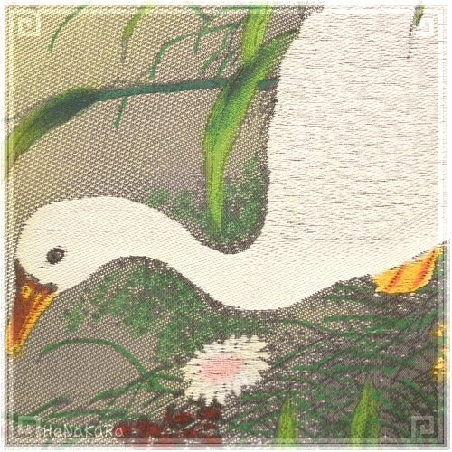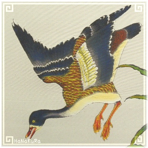 「蘆(=芦、ヨシという植物)」と「雁(がん。鴨の仲間の水鳥)」が描かれた絹織物です。