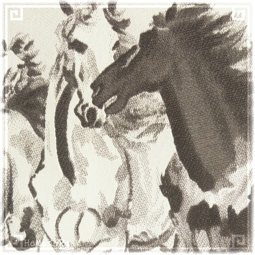 雄々しく駆ける馬の群れが水墨画調に描かれている絹織物です。